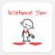 Shows a cute but sad stick figure with a broken heart, holding a wilted flower, and the words "Without You" in red text above. The man stands over two red broken hearts. Sweet and adorable. Customize to change the background color. Great for mailing to people you miss.