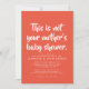 Modern times call for a modern baby shower invitation. If you're taking the party online due to social distancing, this is a perfect invitation for you. The bold playful text reads "This is not your mother's baby shower" and the party details below include room for online social meeting information, registry, shipping info and more along with the party details. The back features a coordinating playful dot pattern. The gender neutral coral color is default, but it can be changed by clicking "customize further." Great for co-ed showers, adoption showers and two dad or two mom couple showers too!