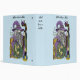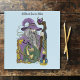 A wizard all in purple holding a staff that has a purple crystal ball. A small green dragon, Celtic knot work, candle and a border of autumn leaves all in a backdrop of light blue