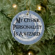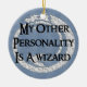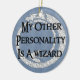 Text says: "My other personality is a wizard." Great design to wear on a button, sticker or shirt to remind others there is more than one reality in the flat world they think exists.