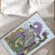 A wizard all in purple holding a staff that has a purple crystal ball. A small green dragon, Celtic knot work, candle and a border of autumn leaves all in a backdrop of light blue