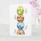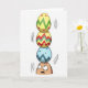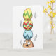 This card shows an earthy, root-shaped character standing against a white background, with wide upturned eyes that make it look nervously devoted to keeping things together for someone it cares about 🐰. Balanced right on its head is a tall, wobbly stack of three egg-shaped decorations, turning the scene into a funny little test of trust and loyalty. Curved motion marks on either side of the stack suggest a shaky tremble, as if the character is trying not to let a friend down. The top egg is sunny yellow with green chevrons and scattered pink dots, adding a light, flirty touch to the precarious tower 🌷. The middle egg is also yellow, patterned with red and green zigzags that feel like a lively back-and-forth between two close companions. The bottom egg is sky blue with dark blue zigzags, sitting nearest the character’s brow like the steady part of a relationship. The greeting text sits near the top in a soft spring green, with a smaller line beneath it in light gray. Thin dark outlines and smooth shading define the character and eggs, and the stack leans slightly to one side with wobble lines drawn beside it.