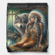 A Native Indian woman, adorned in traditional attire and jewelry, sits gracefully by a tranquil river, her long hair cascading around her