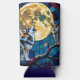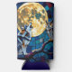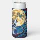 A wildlife themed can cooler. A vibrant colorful ai illustration of a mosaic style wolf, an owl and a full moon in a stained glass vibe.