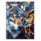 A vibrant colorful ai illustration of a wolf and an owl in a mosaic stained glass effect. A nice notebook for those who love wildlife.