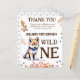 Cute fluffy wolf cub wild one woodlands birthday party template thank you card, with brown fall leaves, nice for fall winter time party also for national parks wilderness party theme.
