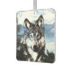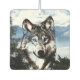 Wolf, or timberwolf, face superimposed over a wilderness background with sky and snowy mountains in the background showing through areas of the wolf face wildlife lovers hanging air freshener. Scent selection can be changed