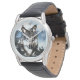 Wolf, or timberwolf, face layered onto a snowy mountain wilderness background with the background showing through parts of the wolf face to create a unique wrist watch