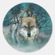 Beautiful Wolf on a Foggy Night with a Full Moon Picture Art. With blue shades and trees in the back. Wolf art with vivid blue colors photo image.
