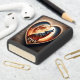 A howling wolf under a full moon with fiery fur, framed by a heart-shaped carving. Bright moon & constellations in a forest clearing, inscribed Ryan