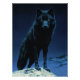 A lone black wolf stands prominently on a rugged, snow-covered cliff, bathed in the soft glow of moonlight. Its sleek coat ripples in the cold night air as piercing eyes glow with intensity, subtly illuminated by the moon. The wolf’s powerful, muscular form is visible from the chest up, exuding dominance and grace. The background remains dark and minimal, with faint mountain silhouettes, drawing all attention to the wolf's commanding presence. Cool blues and purples of the night sky contrast with the stark whites of the snow.