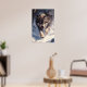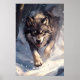 A majestic grey wolf with piercing yellow eyes stands on a thick tree trunk, its powerful paws gripping the bark. The wolf's fur is thick and textured, with a hint of brown around its muzzle. The background features a winter forest. Perfect gift for wolf lovers.
