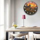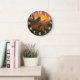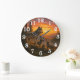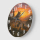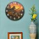 Wilderness wall clock depicts a watchful adult wolf standing on rocks with three curious pups, bathed in golden sunset light over mountain forests. White numerals on warm-toned backdrop create serene wild beauty—perfect for nature lovers or family-themed gifts.