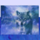 Majestic wolf on a winter's night New Year postcard. The words Peace Joy Love are to the left of the wolf. The colors are wonderful shades of blue, purple and white. The greeting on the back of the card reads: Wishing you a peaceful and harmonious New Year! This striking postcard is very easy to personalize.