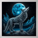 Blue and black fantasy art depicting a lone wolf standing on a mountain in front of a full moon. Ai generated art.