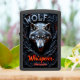 This intense image showcases a custom, matte black rectangular case featuring a formidable and focused graphic. The artwork centers on the head of a powerful gray wolf, staring directly at the viewer with eyes glowing an intense orange-yellow. Its mouth is slightly open in a silent snarl. The creature is framed by a highly detailed, sculpted border of dark, twisting branches and roots, with subtle hints of glowing red embers in the background, enhancing the dark, dramatic mood. The word "WOLF" is displayed at the top in dark silver. Below the wolf, "Whisperer" is scripted in vibrant red text, followed by the name "Alexander" in smaller red text. This striking, high-contrast depiction makes for a bold and artistic collectible item.