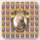 The original artwork and design by ZoeSPEAK on this Coaster features a portrait of the classical music composer Wolfgang Amadeus Mozart. The portrait is a profile set in an ornate oval golden frame. The frame hangs on a purple wallpaper background with golden bunches of grapes in rows, and vertical white and lavender stripes.