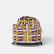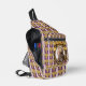 The original illustrations by ZoeSPEAK on this Sling Bag feature a portrait of the classical music composer Wolfgang Amadeus Mozart. The portrait is a profile set in an ornate oval golden frame. The frame hangs on a purple wallpaper background with golden bunches of grapes in rows, and vertical white and lavender stripes.