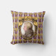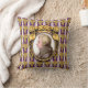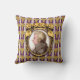 On this music lover's throw pillow is a portrait of the classical music composer Wolfgang Amadeus Mozart. The portrait is a profile set in an ornate oval golden frame with tufted gold ribbons at the top. The frame hangs on a purple wallpaper background with golden bunches of grapes in rows, and vertical white and lavender stripes.