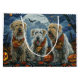 Unleash the spooky spirit with this eerie Halloween design featuring a pack of dogs under a dark, moonlit sky, surrounded by flying bats and glowing pumpkins. Perfect for those who love a touch of frightful fun with their furry friends!