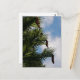 Postcard with photo of wollemi pine tree with cones against a blue sky with white clouds