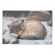A pack of wolves sleeping on the snow covered ground. The wolf leader has the eyes open and are looking at you