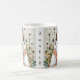 A pretty personalized coffee mug with an illustration of a woman holding a white fluffy cat surrounded by dandelions, The picture has a crochet style fabric look.