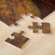 This puzzle features oil painting, "Jewels" by British artist, Thomas Edwin Mostyn (1864 – 1930). It captures a redheaded woman adorned in a rich, deep yellow dress in profile, her eyes closed and hands delicately holding strands of sparkling jewelry. The background has a floral design. The warm lighting gives an almost autumnal feel with shades of red, orange, brown, and dark yellow.
