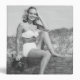 Woman wearing bikini sitting on log on beach, (B&W), (Portrait) | George Marks | AssetID: 57416977