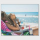 Woman lying on sun lounger covering her face with wrapping paper