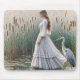 A woman in a long flowing white dress walks through shallow water alongside a blue heron surrounded by dense reeds and cattails
