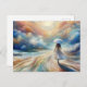 The image shows an artistic, colorful representation of a person standing on a beach, facing the ocean. The person is holding an umbrella and appears to be gazing at a swirling sky filled with vibrant hues and dynamic cloud patterns that converge towards a bright central point. The artwork has a dreamlike quality, with exaggerated curves and waves in the sand leading to the water’s edge, creating a sense of movement throughout the scene.