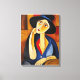 This is a painting of a woman with a hat in a modern style. The woman is wearing a black hat and a blue blouse with a red scarf. The background is made up of warm tones in a geometric pattern. The painting uses bold colors and lines to create contrast and interest. This painting would make a great addition to any art collection or as a statement piece in a room. It can also be printed on various products such as t-shirts, phone cases, etc