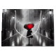 A woman with a red umbrella walks down a dark rainy city street illuminated by old lamposts.