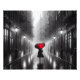 The silhouette of a woman walking on a dark rainy city street with a red umbrella in selective color.