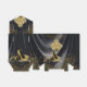 Womans birthday party favor boxes with elegant gold glitter high heel shoes, pretty string of pearls on a black satin and gold background. These elegant black and gold birthday party favor boxes are easily customized by simply adding the text of your choice under the front flap in the font style and wording you prefer. This is a printed design with no real satin, glitter, etc.