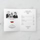 A beautifully styled funeral program featuring a simple white background. On the front cover is a large photo of the deceased with an inset white border, along with their name, dates, and an elegant red rose bouquet. On the inside is the order of service along with a family photo and cemetery information. The backside has the list for all the casket bearers and honoraries.