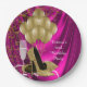 Womans hot pink and gold birthday party paper plates with beautiful gold glitter shoes on a pretty hot pink satin balloon, pearls and champagne swirl background. You can add your own text, and you can remove the champagne glass.