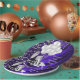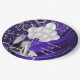 Womans purple and silver birthday party paper plates with beautiful silver glitter shoes on a pretty purple satin balloon, pearls and champagne swirl background. You can add your own text, and you can remove the champagne glass.
