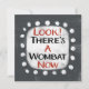 An irreverently weird typographic animal design that says "Look! There's A Wombat Now". It features black and red text on a white rectangle with funky, playful white dots surrounding it, all on a gray background.