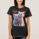 A women’s T-shirt in a soft, high-quality fabric, featuring a stylish black color as the base. The centerpiece of the design is an adorable black kitten with expressive eyes, positioned on the front. The kitten has a sleek and shiny coat, blending subtly into the black background of the shirt, yet standing out with its bright eyes and delicate whiskers. The T-shirt has a classic crew neck and short sleeves, offering a comfortable and flattering fit. The design is both playful and elegant, making it a versatile piece for casual or slightly dressy outfits.