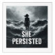 A striking black-and-white wall art print featuring the silhouette of a woman standing strong amid turbulent waves. With her hair blowing in the wind and posture upright, she faces the storm with unwavering resolve. Bold typography beneath her reads: "SHE PERSISTED", symbolizing strength, endurance, and courage in the face of adversity. The dramatic seascape emphasizes the power of inner strength and resilience, making this piece a bold statement for empowerment.