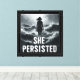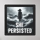 A striking black-and-white wall art print featuring the silhouette of a woman standing strong amid turbulent waves. With her hair blowing in the wind and posture upright, she faces the storm with unwavering resolve. Bold typography beneath her reads: "SHE PERSISTED", symbolizing strength, endurance, and courage in the face of adversity. The dramatic seascape emphasizes the power of inner strength and resilience, making this piece a bold statement for empowerment.