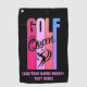 Buy this colorful Women's GOLF QUEEN Custom Name Women's Golf Towel with CUSTOMIZABLE TEXT, designed for women golfers. The artwork shows bold typography spelling GOLF with columns of vibrant colors. The word QUEEN is written in a script font with a crown and there is a black silhouette of a woman giving a golf swing. This Women's Golf Queen Golf Towel would make a great golfing accessory for your golfer friends when going around the green. Using this Golf Queen Golf Towel won't improve your golf swing, help you to break par, or even avoid bogeys BUT it'll add some much needed fun and color. Buy these women's Golf Towels for your next day out or for your golf-themed bachelorette party or to use at golf tournaments throughout the golf season. Matching items available. Comes in vintage color version.