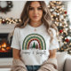 Spread some holiday cheer with this stylish and comfortable Women's Basic T-Shirt! The eye-catching graphic features a modern rainbow design incorporating classic Christmas elements like plaid patterns, stars, and rows of festive Christmas trees in green, white, and red. The cheerful message underneath reads: "merry & bright". This clean, white tee is perfect for women who love trendy holiday apparel, as a festive top for family photos, or a unique alternative to the traditional ugly Christmas sweater.