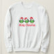 This women's sweatshirt is shown with a cute festive Santa hat wearing trio of penguins singing all in a row.