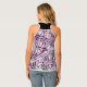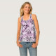 Womens tank top is shown in a cute tropical leaves print design in colors of black, pink, purple and white with white trim.