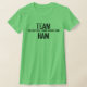 My overall review is that the T-shirt is nice, it fits true to size however the font is significantly smaller than advertised and you can't read it. The printing is unreadable and there is a strain to read it. It does not look like the advertised product. Maybe the shirt color is darker or a larger more visible font should have been used. Photos with and without flash and font is barely legible.
