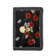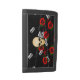 This women's or teen girl's wallet features a skull surrounded by roses, razor blades, barbed wire and blood. It is contradictory, being romantic and violent at the same time.