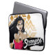 Check out Wonder Woman in front of her logo tribal pattern with "Strength" written atop a painted brush stroke.